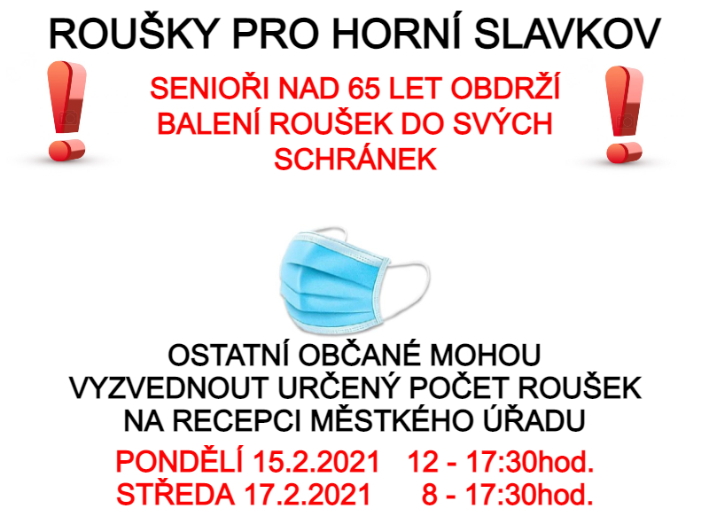Ostatní občané mohou vyzvednout určený počet roušek na recepci Městského úřadu: