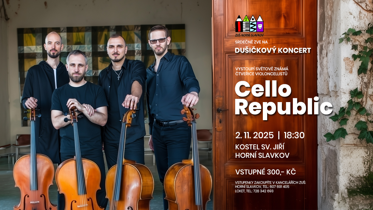 ZUŠ zve na koncert čtveřice známých violoncellistů, který se uskuteční 2. listopadu 2025 v 18:30 v kostele sv. Jiří v Horním Slavkově. Těšit se můžete na jedinečný hudební zážitek. Vstupné je 300 Kč a lístky lze zakoupit v kancelářích ZUŠ Horní Slavkov a Loket.