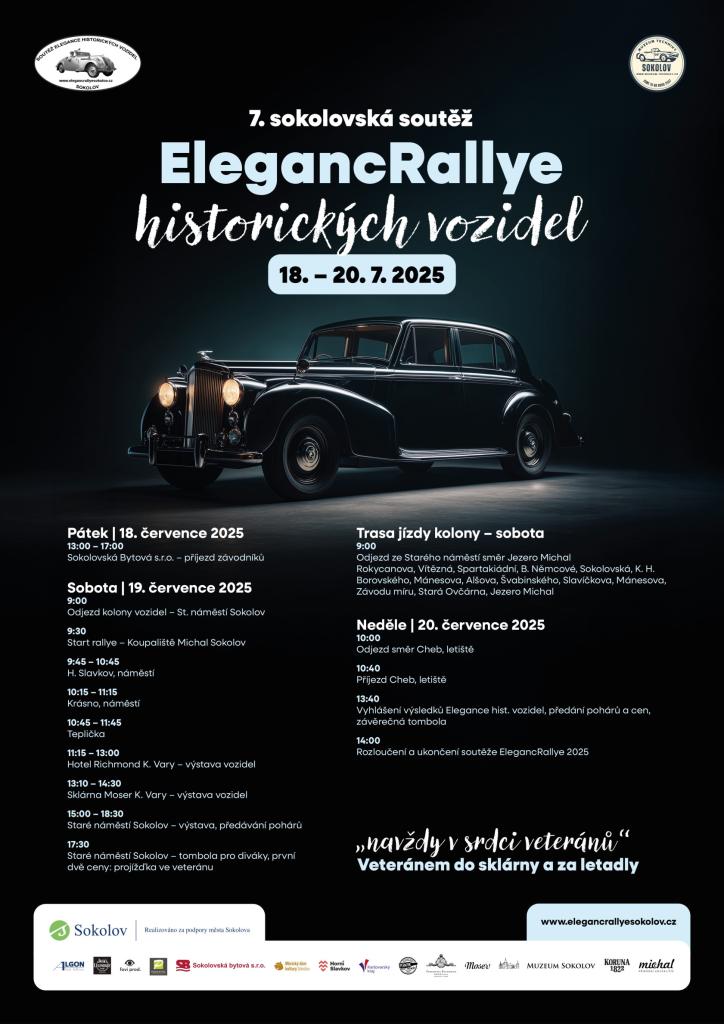 Srdečně Vás zveme na 7. ročník Sokolovské soutěže ElegancRallye historických vozidel spojené s výlety po Karlovarském Kraji. Soutěž pořádá Klub Muzeum Techniky Sokolov v AČR.Letos je připravena krásná trasa Krušnohorskou krajinou, přes Horní Slavkov, Bečov směr Karlovy Vary.