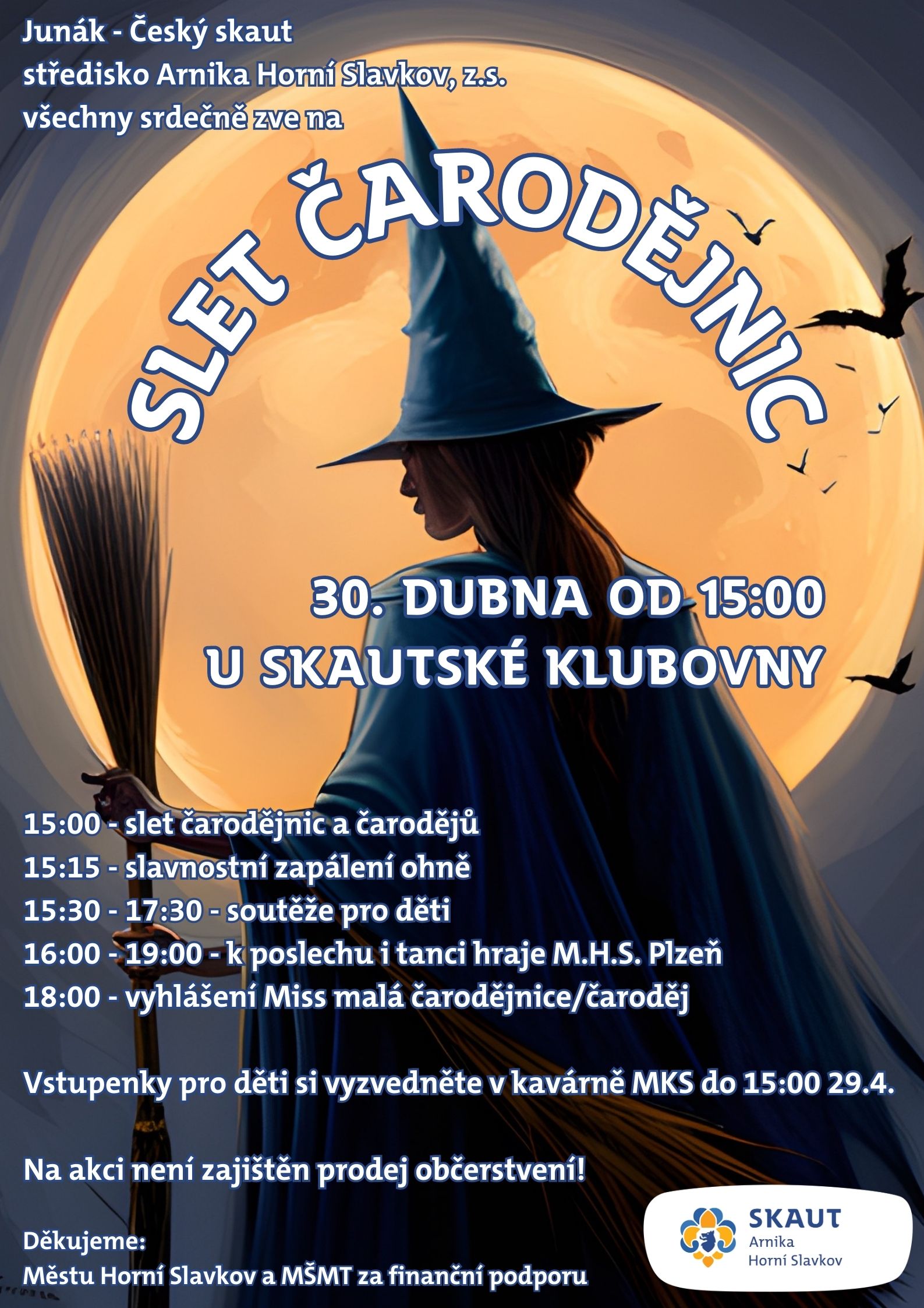 Junák - český skaut, středisko Arnika Horní Slavkov zve na SLET ČARODĚJNIC a ČARODĚJŮ. Více informací v detailu plakátu v příloze.